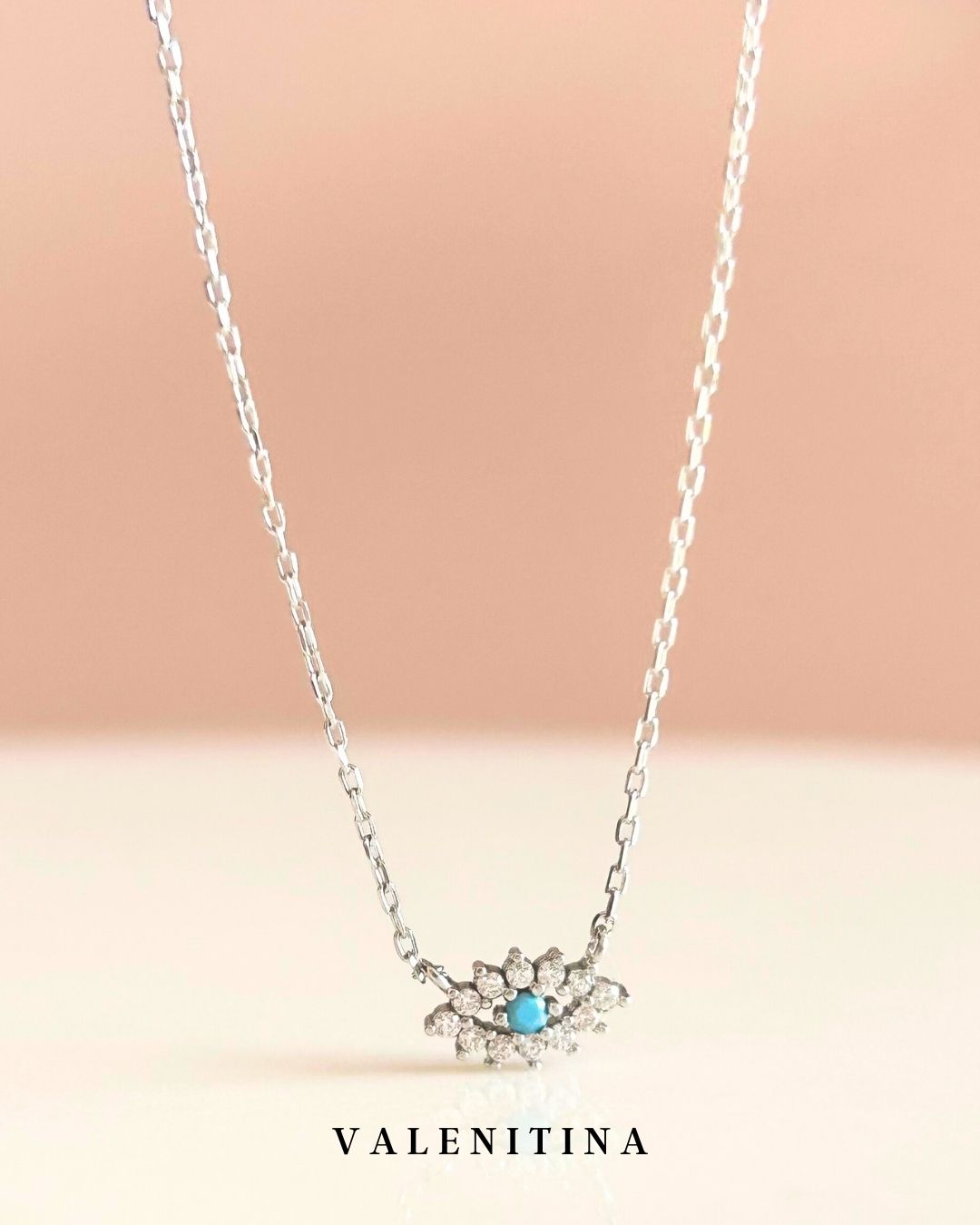 El Collar Abby está elaborado en plata italiana .925 y decorado con un delicado conjunto de zirconias brillantes que forman una silueta radiante alrededor de una piedra central en tono turquesa.